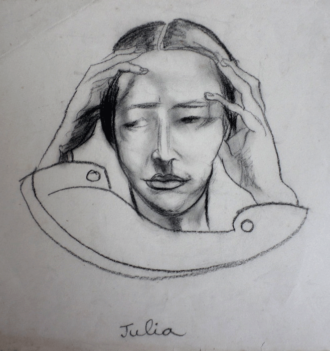 9 x 16 inch stylized sketch titled Julia, unsigned.