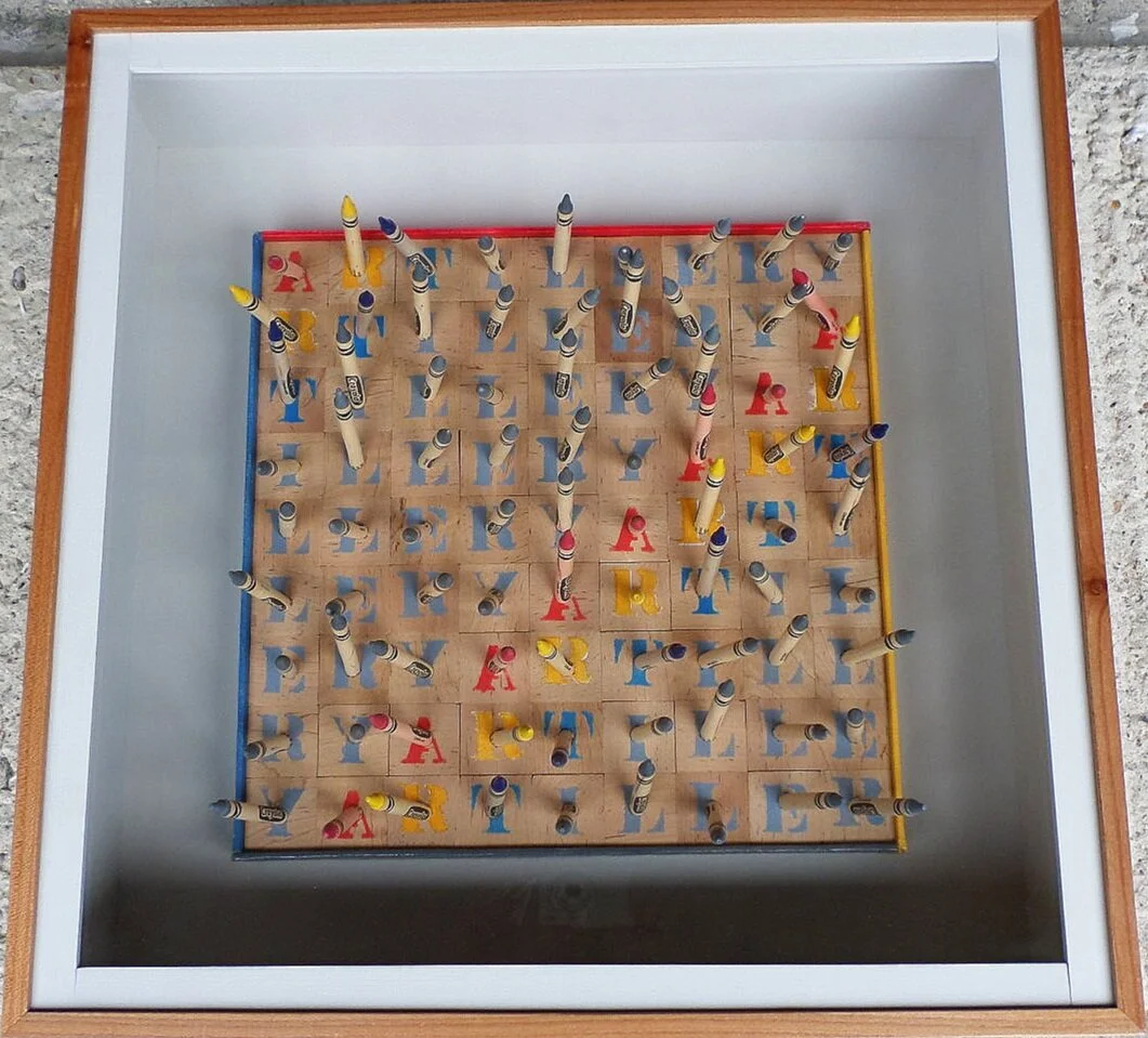 This is a work from the artists make Art not War series utilising childrens crayons and housed in a handmade quality glazed box with painted white interior. It looks stunning…..