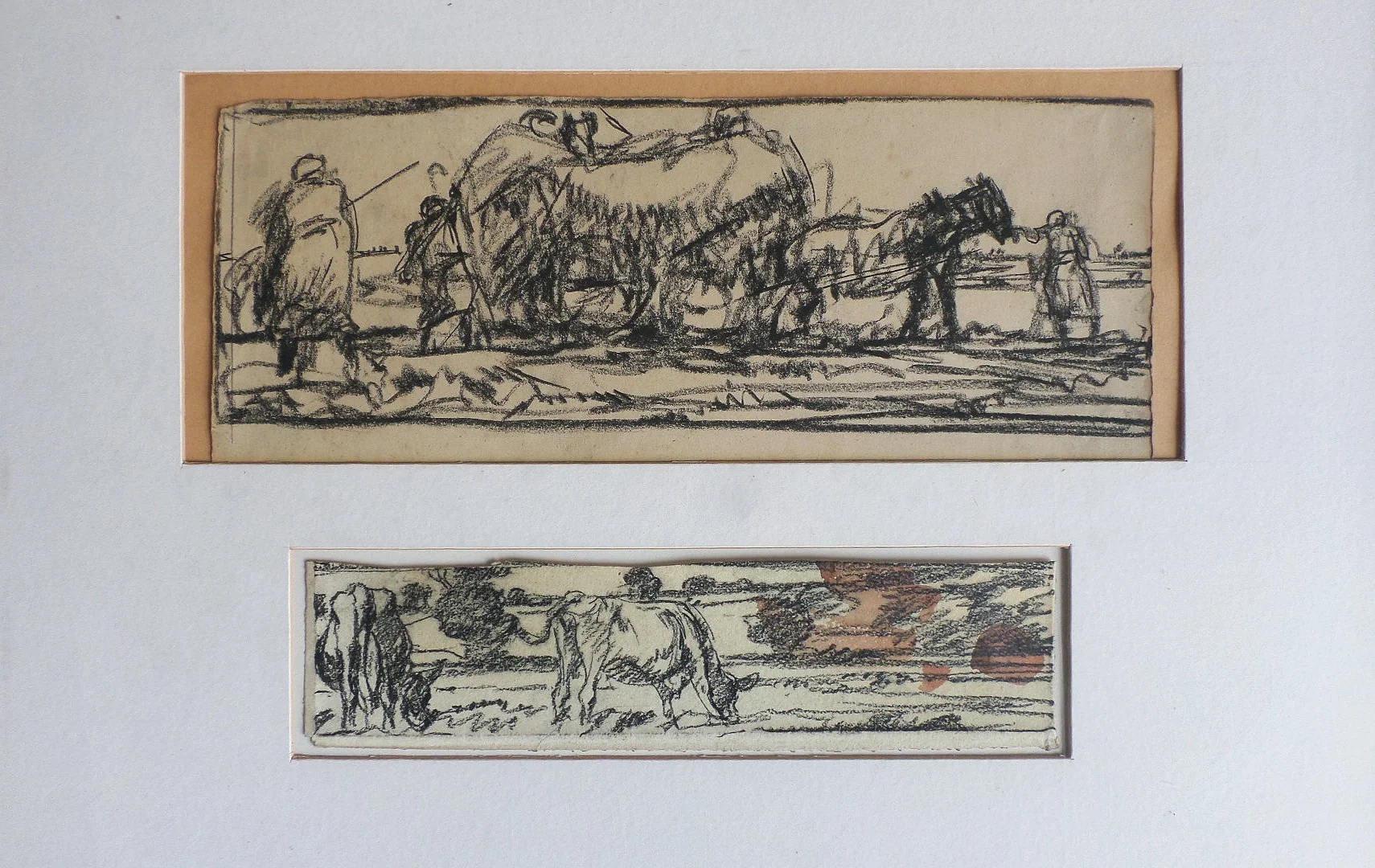 This piece is currently double mounted . The cow image is NOT stained, the reddening is actually watercolour paint over which this work is drawn.