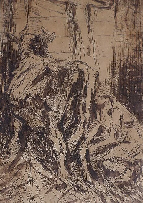 Details about this work can be found in the academic records of David Thompson who wrote the book about Becker. It shows the title to be ‘milking and it is an etching worked up by the artist with Ink and brush. It was owned by David Thompson before he sold it to Lorna and David Turner . The piece was exhibited in the Ipswich museum show in 1993 was originally from the Kenneth Green collection and sold through the Simon Carter Gallery . These details are also written verso in David Thompson’s own handwriting .