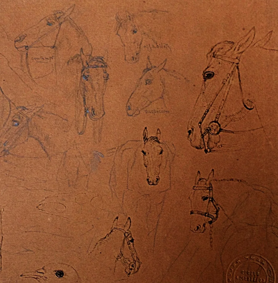 Pencil sketch for sale 'Horses heads' Circa 1900 with studio stamp.