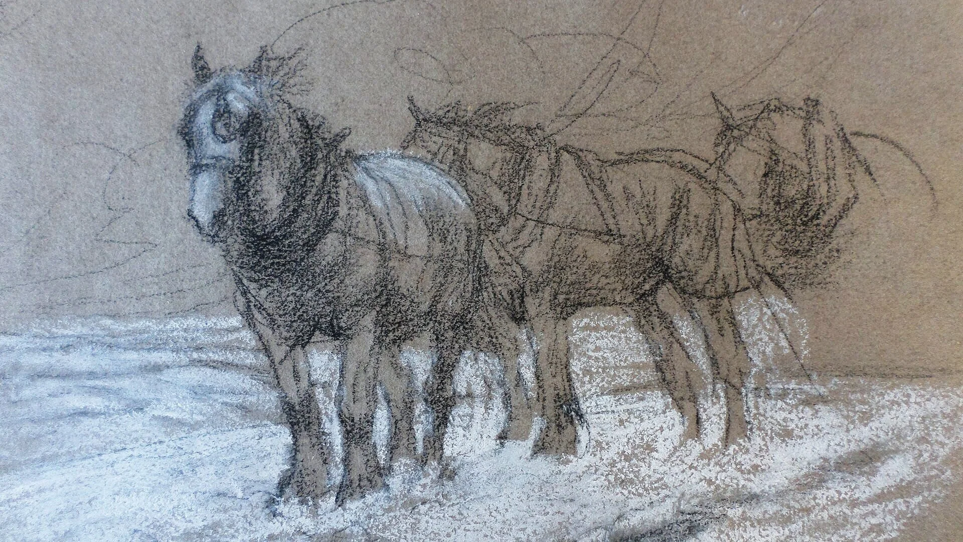 8 x 6 inch chalks on paper, taken from her sketch book , studio sale stamp l/r and Messums Gallery label verso with title “waiting in the snow”